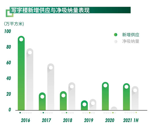 2021年第二季度,兩個(gè)甲級(jí)寫(xiě)字樓項(xiàng)目投入使用,分別位于珠江新城的萬(wàn)科中心和魚(yú)珠的行信中心,為市場(chǎng)帶來(lái)約15萬(wàn)平方米的寫(xiě)字樓面積。其中,萬(wàn)科中心是珠江新城近五個(gè)季度以來(lái)的首個(gè)新增辦公項(xiàng)目。行信中心則位于黃埔區(qū),在規(guī)劃中的廣州第二CBD之中。廣州上半年合共新增34萬(wàn)平方米優(yōu)質(zhì)辦公面積,同比增長(zhǎng)58%。