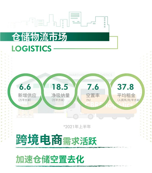 廣州第二季度沒(méi)有新增物流倉(cāng)供應(yīng),但凈吸納量仍然錄得近八個(gè)季度以來(lái)的第二高。2021年上半年凈吸納量達(dá)到18.5萬(wàn)平方米,比2020年全年還要高31.7%。去化主要集中在花都、番禺和南沙的高標(biāo)倉(cāng)庫(kù)。行業(yè)方面,跨境電商表現(xiàn)最為積極,除承租廣州北部超過(guò)十萬(wàn)平方米的倉(cāng)庫(kù)以外,在佛山也錄得超過(guò)十萬(wàn)平方米的倉(cāng)儲(chǔ)租賃成交。除此以外,上半年,制造業(yè)和生鮮電商也持續(xù)在珠江口西岸的廣州和佛山承租高標(biāo)和普通倉(cāng)儲(chǔ)設(shè)施。