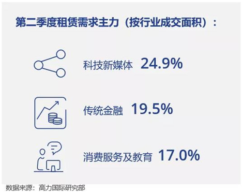 從行業角度來看,科技新媒體、傳統金融及消費服務為驅動辦公存量去化的前三大需求主力。 此外,國內外制造業的需求也有所回暖。