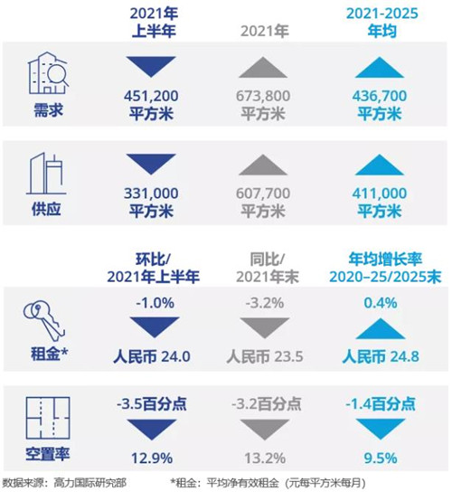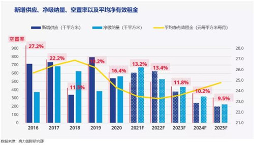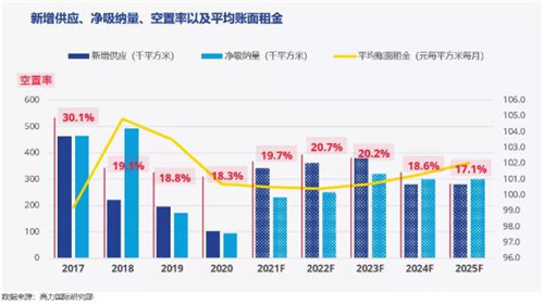 隨后的2022年,預計全年仍將有超60萬平方米的新增供應面積,此后供應回落,平均租金逐步回升。