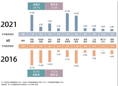 科技新媒體(簡稱TMT)行業作為目前寫字樓最重要的需求來源之一,在投資風口的加持下,其寫字樓租賃需求迅速擴張。對比2016年武漢甲級寫字樓產業結構,TMT行業的總體租賃面積占比已經高達22.2%,較五年前翻了一倍有余,行業的平均租賃面積也已經超過1,000平方米。