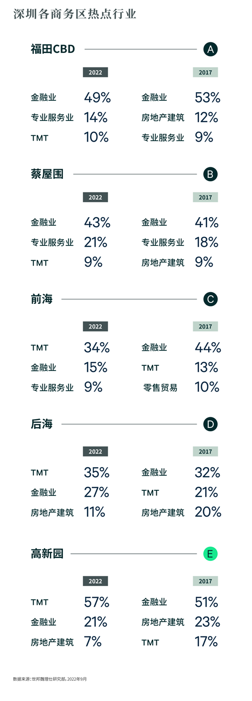 TMT和金融穩(wěn)居深圳主要商務(wù)片區(qū)需求榜的前兩席,其中TMT板塊需求增長迅猛,替代5年前部分片區(qū)位居第二位的專業(yè)服務(wù)及房地產(chǎn)建筑板塊的需求。TMT在各大商務(wù)片區(qū)中的需求比例均有顯著提升,且呈現(xiàn)出對(duì)于南山區(qū)明顯的市場(chǎng)偏好,主要原因在于高新園區(qū)、后海片區(qū)作為頭部科技總部所在地,吸引了眾多上下游企業(yè),從而形成了較為完整的科技生態(tài)圈,不斷帶動(dòng)科技企業(yè)的聚集。而金融行業(yè)需求則橫跨多個(gè)商務(wù)片區(qū),福田和南山區(qū)均納入選址考慮范圍,從前海、后海和高新園區(qū)來看,金融業(yè)板塊均為第二大需求來源。此外,專業(yè)服務(wù)業(yè)和房地產(chǎn)建筑作為第三位需求來源,則因片區(qū)分布而有差異。專業(yè)服務(wù)業(yè)需求主要分布在原本占比較高的福田CBD和蔡屋圍兩大片區(qū),以及相應(yīng)產(chǎn)業(yè)政策引導(dǎo)下的前海片區(qū),其中福田CBD更是聚集了全市近一半的專業(yè)服務(wù)業(yè)需求,三大商務(wù)片區(qū)中均監(jiān)測(cè)到3個(gè)百分點(diǎn)以上的需求提升。而房地產(chǎn)建筑需求則主要分布在近年來房地產(chǎn)項(xiàng)目新增供應(yīng)較多的高新園和后海片區(qū),近項(xiàng)目擇址偏好明顯。但受房地產(chǎn)行業(yè)政策調(diào)控的影響,在兩大商務(wù)片區(qū)的需求比例對(duì)比5年前均有約10個(gè)百分點(diǎn)的減少。