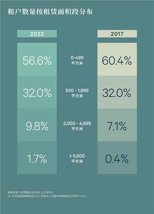 對(duì)比2022年和2017年不同面積段租戶數(shù)量占比,可以發(fā)現(xiàn),中小型租戶比例下降較為明顯,500平方米以下的小型租戶占比相較5年前下降3.9個(gè)百分點(diǎn)。而2,000平方米以上的中大型租戶和5,000平米以上的特大型租戶占比5年間則分別上升2.7和1.3個(gè)百分點(diǎn),其中5,000平方米以上的特大型租戶數(shù)量從2017年僅有15家躍升到2020年的75家,同比增長高達(dá)4倍。