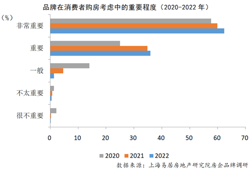 2022年消費端調(diào)研結(jié)果顯示,品牌在消費者購房行為中起著重大的影響。2022年,在消費者對房企品牌重視程度方面,選擇非常重要的達62.34%,較2021年上升2.51個百分點。選擇重要的占比35.89%,較2021年上升1.11個百分點。選擇一般的占比1.24%,不太重要的占比0.42%,很不重要的占比為0.11%,這幾項均小于2021年的占比。總體看來,房企品牌成為消費者購房行為中越來越重要的考量因素。