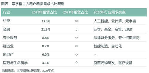 “產業互聯網、生物醫藥、首店經濟、供應鏈物流成為新的市場熱點”,世邦魏理仕中國區研究部負責人謝晨預計,科技和金融仍將是2022年寫字樓的主力需求引擎,兩大行業在寫字樓租賃成交的貢獻占比將基本保持在2021年的水平,助推需求的子行業將有新的亮點出現。
