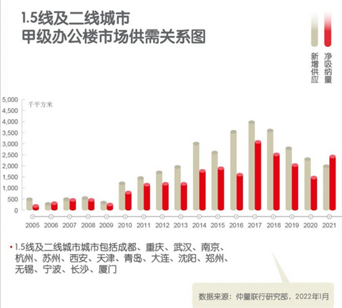 在經(jīng)濟(jì)回暖的支持下,2021年成為了中國(guó)辦公樓市場(chǎng)有史以來需求增量最為強(qiáng)勁的年份之一,全年多個(gè)城市的凈吸納量突破了歷史新高。全年主要城市的凈吸納量達(dá)到660萬平方米。