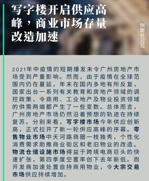 展望2022年,廣州將有約74萬平方米的優(yōu)質(zhì)寫字樓投入市場,較2021年減少21%,但供應(yīng)水平仍處于高位,空置率攀升的可能性仍然存在,租金將面臨下行壓力。