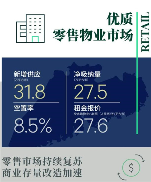 2021年第四季度,海珠區(qū)合生新天地開業(yè),為海珠區(qū)帶來7萬平方米的優(yōu)質(zhì)商業(yè)空間。廣州優(yōu)質(zhì)零售物業(yè)市場全年新增供應(yīng)為32萬平方米,較2020年減少22%。吸納量方面,年末出現(xiàn)百貨及包括天河區(qū)書店在內(nèi)的零星大面積租戶關(guān)店,四季度空置率環(huán)比上升0.7個百分點,至年末的8.5%。從全年來看,上半年的新增供應(yīng)項目均錄得較理想的入駐水平,全市空置率仍能與2020年末持平,無漲跌。