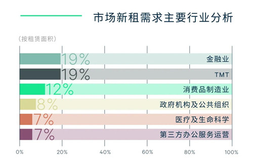行業需求方面,全市場注冊制逐步推進為資本市場體制擴容,季內以證券、基金、資管擴租為主的金融需求進一步激活,位居首位,陸家嘴及其外圍市場與外灘區域特別活躍;TMT緊隨其次,細分產業回歸底層技術研發,以人工智能、金融科技、企業應用軟件等產業互聯網表現突顯,在閔行、浦東前灘、虹口區域等皆有升級擴點;消費品制造業受資本青睞的新能源汽車及化妝品類引領布局,同時生物醫藥及醫療器械類企業從商務園區升級差異化選址寫字樓市場的情況持續。此外,第三方辦公服務運營以精裝獨立辦公室模式為首持續擴張步伐,聚焦可租空間相對充裕的核心及核心拓展區。以成交類型來看,搬遷擴租占市場八成以上,一千平方米以上中大面積段租賃需求于季內落地增多,成交筆數占比62%。