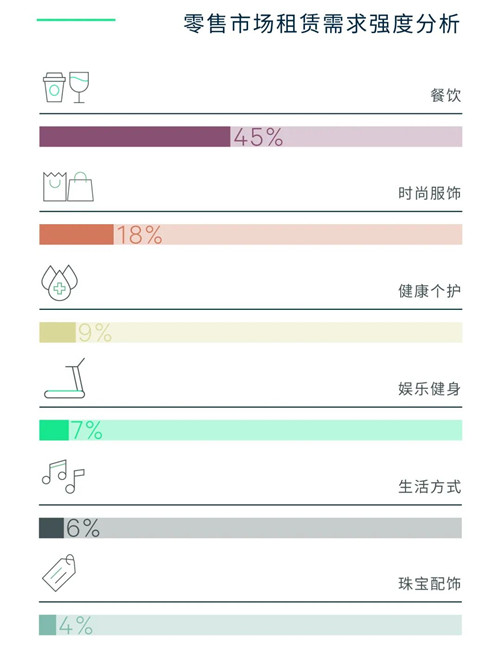 餐飲依舊是主要驅動力,需求占比45%,其中以咖啡茶飲和亞洲食肆品類需求特別亮眼。咖啡茶飲賽道競爭依舊火熱,本季度Blue Bottle Coffee內地首店亮相上海蘇州河畔,其排隊盛況刷屏各大社交網絡,而其上海第二家門店也于靜安嘉里中心圍擋。M Stand于靜安大悅城開出首家冰淇淋概念店,推出多樣創新產品線。中式飲品借勢國潮加速發展,1828王老吉于尚悅灣開出旗艦店,而來自廣西的特色茶飲品牌阿嬤手作上海首店也于新天地開業,繼連鎖茶飲加速擴張之后,行業迎來新一波國潮創新新浪潮。此外,以日本和泰國料理為主的亞洲食肆本季度布點積極。時尚服飾需求熱度不減,占比18%。冬奧余溫推動運動品牌持續擴張,NB GREY概念店亮相環貿,德國奢華運動品牌BOGNER入駐恒隆廣場。潮流設計品牌集結前灘太古里,多家重磅首店相繼入駐。服務業態占比16%,以美容和美發沙龍為主的個護品類擴張積極。截至季末,全市空置率環比下降0.3百分點至三年新低6.4%,全市購物中心首層租金環比上升0.4%至每天每平方米人民幣34.9元。