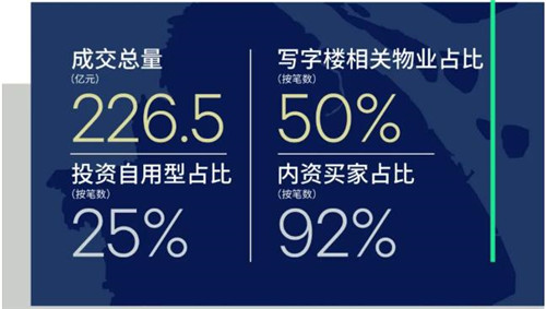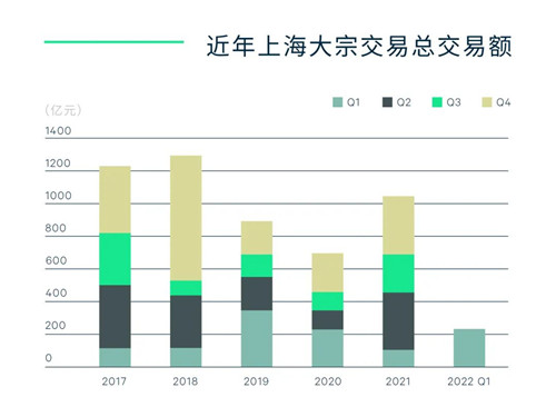 2022年第一季度,上海物業投資市場共錄得12筆大宗交易,交易金額共計人民幣226.5億元,環比下降36.4%,同比上升91.8%。盡管本季度時值春節假期,疊加季末疫情突襲申城,季內成交總額依舊高于近五年同期均值。投資型交易依舊占據主導,自用型交易僅占25%,側面反映目前投資者意向逐漸走強。