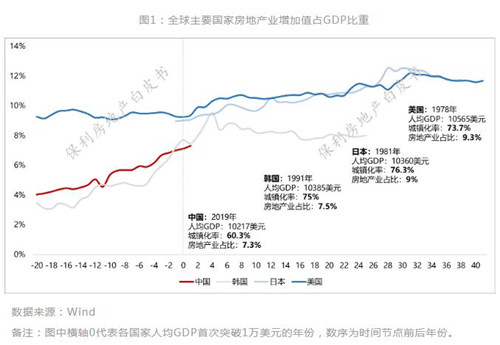 我國房地產業對經濟增長的貢獻仍有提升空間。對比發達國家,我國房地產業增加值占GDP比重并不算突出,以人均GDP突破1萬美元為時間節點,我國房地產業占比較美國、日本等分別低2個百分點、1.7個百分點。