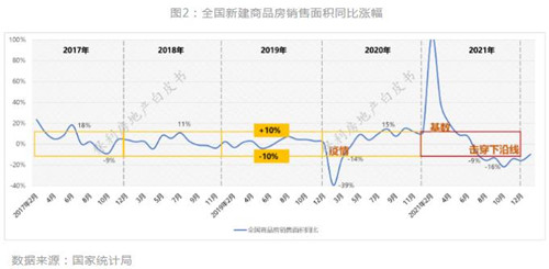 2021年,由于政策疊加效應,伴隨行業出清壓力,市場向下擊破箱體,出現超預期下跌。從保利來訪數據看,上半年周度盤均來訪80-100組,下半年周度盤均來訪50-60組,呈現斷崖式下滑,環比下降38%,同比下降33%,反映出整體市場信心嚴重不足。從全國商品房銷售面積來看,上半年同比增長27%,7月單月同比年內首次轉負,下半年同比下降15%。主流房企銷售額降幅更大,以TOP10房企為例,下半年銷售額同比下降28%。全國商品房銷售均價從8月開始下降明顯,12月商品房銷售均價9512元/平方米,相比年初下降13.8%。保利6048價格指數也從8月開始下跌,并連續5個月下降。土地市場下行明顯,相比一批次供地,全國22城三批次土地出讓金下降47%,流拍或中止出讓率達19%,平均溢價率僅2.3%,地價下降1000-2000元/平方米。