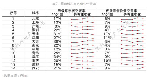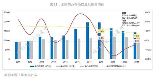 全國商業及辦公市場容量2017年見頂后連續四年下降,在商品房銷售額中占比不斷下滑,從2018年1.96萬億、13.1%回落至2021年1.4萬億、7.9%,銷售均價連續三年回落。同時結構性矛盾明顯,經營性物業尤其是商業及辦公的供給和需求不匹配,需求集中在一二線城市、產業強、需求大的核心板塊,但一二線非核心板塊與三四線城市供應偏大,空置率上升。