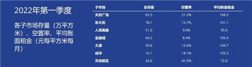 截至2022年第一季度末,成都市甲級寫字樓總存量約349.6萬平方米,凈吸納量錄得2.9萬平方米,傳統(tǒng)金融、商務(wù)服務(wù)及科技新媒體為三大需求主力,全市空置率環(huán)比上升0.5個(gè)百分點(diǎn)至15.9%,平均賬面租金環(huán)比上升0.1%,為100.6元每平方米每月。