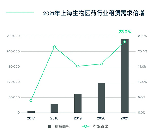2021年上海商務園區寫字樓市場供需兩旺,年凈吸納量突破百萬大關,租金漲幅創三年來新高。行業需求方面,生物醫藥以23%的占比位列第二,其中張江板塊承接了過半的成交面積,政策導向效果顯著,產業集聚效應進一步加強;得益于生物醫藥特色商務園區的交付,浦江板塊同樣表現出強勁的吸引力。