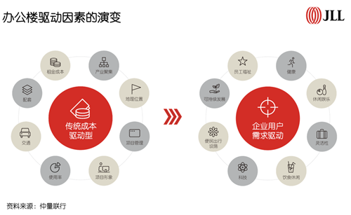 發展路線的改變也引發辦公樓需求的驅動力的變化。從傳統的成本驅動型,演變為企業用戶需求驅動型。健康、科技、可持續發展、休閑娛樂等為創造用戶良好體驗而打造的設施設備與服務成為辦公樓項目的新標配。