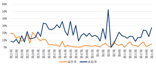 2021年第21周-2022年第21周重點監測城市土地溢價率與流拍率走勢(%)