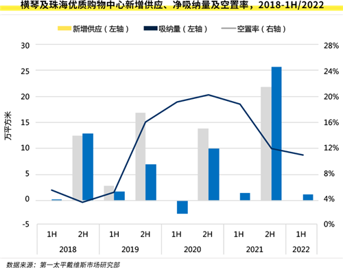 2022年上半年,盡管橫琴及珠海商用物業市場去化壓力猶存,但得益于期內寫字樓及零售市場數個大面積租賃成交的達成,寫字樓市場空置率近兩年首降,零售市場空置率降至近三年最低。