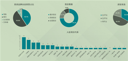 上半年重慶共引進(jìn)54家首店,其中74%是重慶首店,16%是西南首店,10%是全國(guó)首店;從業(yè)態(tài)來(lái)看,50%是餐飲品牌,41%是零售品牌,生活配套和文體娛則分別占5%和4%;而從開(kāi)業(yè)時(shí)間來(lái)看,首進(jìn)品牌中,在一季度開(kāi)業(yè)的有33%,二季度開(kāi)業(yè)的占46%,剩下的21%預(yù)計(jì)在下半年開(kāi)業(yè)。