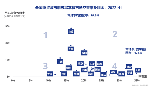 截至二季度末,全國重點20個城市甲級寫字樓市場存量約7,700萬平方米。市場平均空置率維持在19.6%,平均凈有效租金為174.4元每月每平方米。當前,僅北京和上海同時有著較高的租金水平和較為合理的空置率。