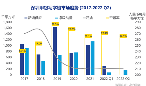 深圳甲級寫字樓市場需求在二季度陸續(xù)釋放,市場回暖態(tài)勢顯現(xiàn)。二季度度租金水平延續(xù)了自去年以來的平穩(wěn)走勢,空置率環(huán)比小幅下降。上半年大宗的租賃成交多來自于受疫情影響較小及寬松政策利好的傳統(tǒng)金融業(yè)。
