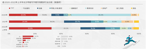 從需求行業(yè)來看,TMT、專業(yè)服務和金融行業(yè)引領上半年長沙甲級寫字樓市場租賃成交,三者共占到上半年成交面積超七成。