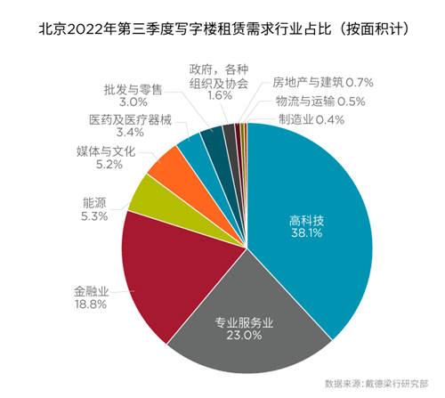三季度,在北京寫字樓市場租賃成交中,高科技、專業(yè)服務業(yè)和金融業(yè)繼續(xù)位居成交前三甲,分別占所有行業(yè)總成交面積的38.1%、23.0%和18.8%。在國家大力發(fā)展“碳達峰”和“碳中和”目標的過程中,能源行業(yè)迎來低碳轉(zhuǎn)型期,本季度能源行業(yè)成交占所有行業(yè)總成交面積的5.3%,位居各行業(yè)第四位。