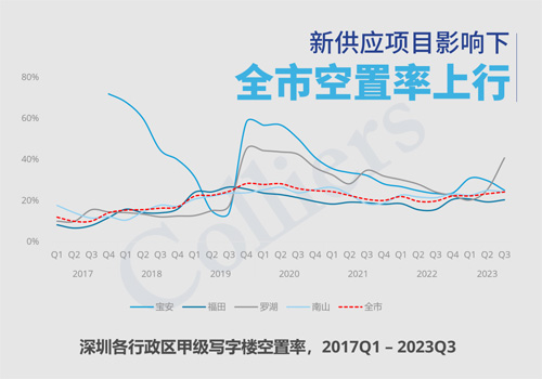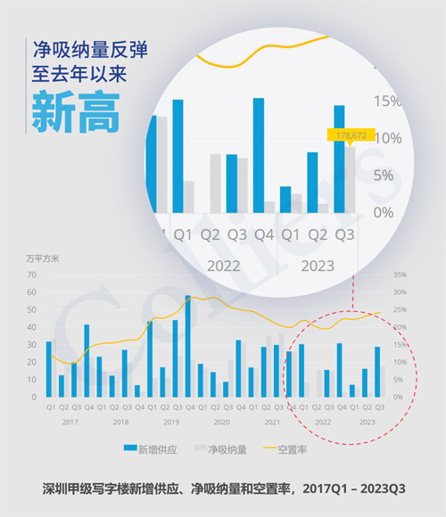 回顧2023年第三季度深圳寫字樓市場表現(xiàn),累積的需求逐步釋放,全市甲級寫字樓吸納量反彈至去年以來最高值;具有獨(dú)特競爭優(yōu)勢的區(qū)域標(biāo)桿型項(xiàng)目更受市場青睞,新入市項(xiàng)目的預(yù)租及自用亦有力支撐了吸納表現(xiàn)。而租金仍然延續(xù)下行趨勢,其中,標(biāo)桿型優(yōu)質(zhì)存量項(xiàng)目的降價(jià)舉措多帶來較好的去化效果。在新供應(yīng)項(xiàng)目空置面積較高的影響下,全市空置率上升至24.3%。