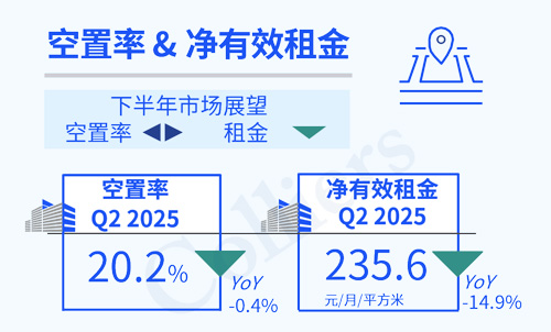 2025年第二季度,北京甲級寫字樓延續一季度“總量去化、區域分化”的態勢。空置率連續七個季度穩定在20%左右的水平,市場正處于新增供需動態平衡階段。凈有效租金降幅進一步收窄,為近三季度最小租金降幅。