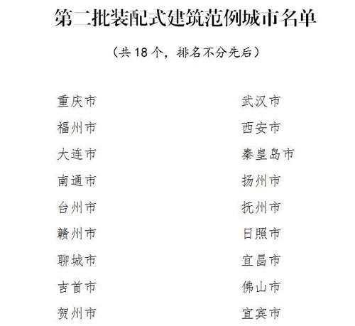 9月15日電 據住建部網站消息,住建部辦公廳15日發布《關于認定第二批裝配式建筑范例城市和產業基地的通知》(以下簡稱《通知》),認定重慶市等18個城市為第二批裝配式建筑范例城市,天津市現代建筑產業園區等12個園區、北京建工集團有限責任公司等121家企業為第二批裝配式建筑產業基地。