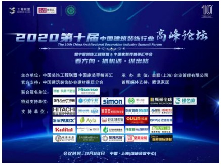 2020年11月28日,【第十屆中國建筑裝飾行業高峰論壇】在上海市長寧區協和路111號綠地會議中心舉行。本次高峰論壇由中國裝飾工程聯盟、中國家裝界精英匯聯合主辦,中國建筑裝飾協會建材家居分會支持,裝聯(上海)企業管理有限公司承辦,特地·負離子瓷磚、海信中央空調聯合冠名。本次峰會建筑裝飾行業內大咖匯集,共聚一堂,圍繞“看方向·抓機遇·謀出路”這一主題,共同探討新時代行業發展的現狀與面臨的機遇和挑戰。