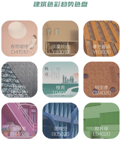 2021色彩趨勢總結出三大主題:重構、協同、快閃;九大色彩:春熙繾綣(O41510)、淡漠致遠(Y83010)、暮色婆娑(Y63030)、熔巖灰 (B05502)、桃青(T04020)、焰窯赤(O24020)、微醺紫(R44020)、落晚空(B05020)、膠片綠(L04020),作為未來中短期或中長期內建筑外立面的前瞻色彩趨勢,以期激發人們樂觀向上的精神,重振旗鼓向前邁進。