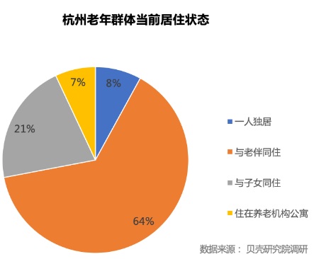 調(diào)研顯示杭州72%的老人獨立居住(一人獨居或與老伴住),僅有21%的老人當(dāng)前與子女共同居住。
