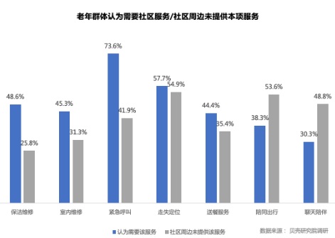 在對社區(qū)服務(wù)的要求上,老人同樣看重人身安全,73.6%的老人認(rèn)為需要緊急呼叫服務(wù),57.7%需要走失定位服務(wù),其次是居家類社區(qū)服務(wù),如保潔維修(48.6%)。不過,社區(qū)內(nèi)服務(wù)項目已經(jīng)大多覆蓋保潔和維修,相對來說,人身安全類覆蓋率較低。