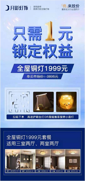 月影家居重磅推出的1999全銅燈具全屋套餐,擁有獨特匠心品質,關注月影直播間下單還能獲得超值好禮。拍付1元預定特權,到天貓【月影凱頓家居旗艦店】購買1999元全銅燈具全屋套餐,可獲驚喜贈品。