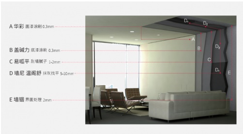 一般來說,客廳、臥室墻面系統根據裝修次序來選購所需材料,分別是墻體界面處理、墻面找平、批刮膩子、打磨、墻體面漆涂刷。