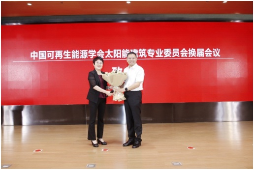 論壇同期還舉行了中國可再生能源學會太陽能建筑專業委員會的換屆會議,專委會秘書長張磊做專委會總結演講。張磊介紹,太陽能建筑專業委員會是在2004年成立,始終遵循一個宗旨,就是在可持續發展的框架下,滿足建筑對清潔能源需求為目標,為太陽能建筑應用構建學術和技術交流平臺。太陽能建筑專業委員會的會員們共同創造了這樣一個技術支撐平臺,而專委會組織建立的太陽能建筑國家標準也發揮著重要指導作用,并一直致力于和企業共同引導創新新產品。同時,太陽能建筑專委會一直通過設計手段和工程實踐,向相關行業傳播低碳節能環保理念,目前在36個城市、56所建筑類院校進行了62次太陽能建筑與一體化的科普宣傳活動。我們相信并有決心,讓太陽能建筑專業委員會在未來的雙碳目標之下可以發揮更大的作用。張磊代表中國可再生能源學會太陽能建筑專業委員會向即將換屆的專委會主任委員仲繼壽先生獻花并表示衷心的感謝。
