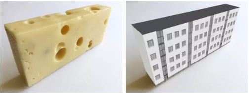 奶酪上的洞是圓形的,分布不規則。而在建筑立面上,洞即是窗洞,但很少是圓形的,通常是有邊有角的,均勻排列著。所以,一塊帶有“窗洞”的建筑平面與一塊奶酪切面有著明顯的不同。奶酪的“窗洞”有時大、有時小,有時是孤立的,或者有時看起來像完整的一組。這種分布就使得奶酪看起來很有趣。而由于建筑的統一性,外墻立面往往顯得單調乏味。