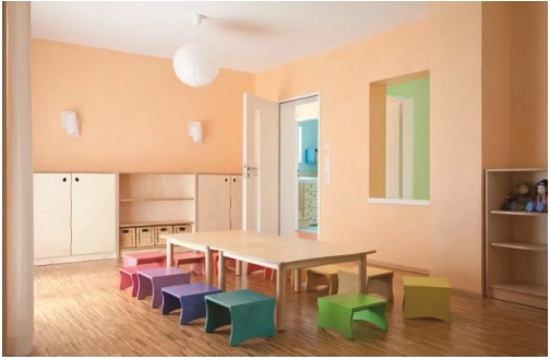 被提名為“德國設(shè)計(jì)獎(jiǎng)”和“建筑和室內(nèi)設(shè)計(jì)獎(jiǎng)”的德愛威總部員工幼兒園,它的衛(wèi)生間采用柔和的綠色和藍(lán)色色調(diào),給人以清新干凈的感覺;活動(dòng)區(qū)和午睡教室均采用溫暖的橙黃色并創(chuàng)意性的使用了紅色的裝飾釉面,不同的照明條件和方向會(huì)產(chǎn)生不同的明暗色調(diào),使空間具有整體感、協(xié)調(diào)感,同時(shí)可以讓孩子們感受色彩的變化,擁有更多的想象空間。