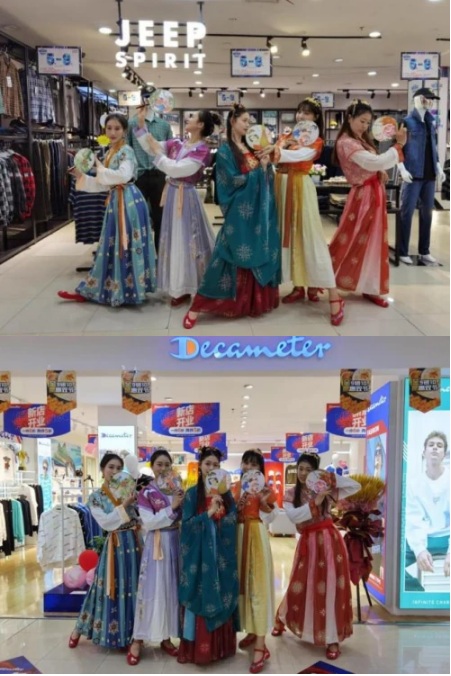 除了舞蹈表演,小姐姐們還以太平奧萊的主力品牌為表演背景,把漢服融入現代服飾,激起了古代和現代的審美碰撞,讓服飾文化沿著千年的脈搏自然交織,構筑起一幅流動的畫面,令現場的顧客賞心悅目,駐足拍照。