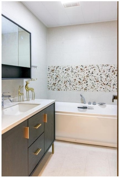在浴室,用瓷磚搭配大塊水磨石跳色,時尚而優(yōu)雅,灰色的浴室柜呈現(xiàn)出高級而內(nèi)斂的格調(diào),讓整個衛(wèi)浴空間舒服愜意。