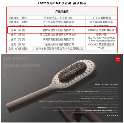 2022國際CMF設計獎獲獎作品及獎項授予名單于近日隆重揭曉,箭牌家居ORI系列搓淋按摩花灑榮獲產品類金獎(家居),是8個產品類金獎中,唯一一個家居領域的產品,工業設計能力再獲國際認可。