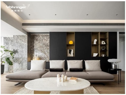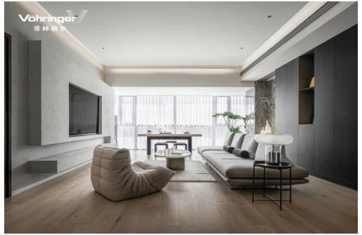白、米灰、深灰、炭黑;大理石、藝術漆、絨布……深深淺淺的顏色與各種不同的材質在客廳匯集,看似不經意,卻讓整個空間呈現出一種帶有生命力的呼吸感。