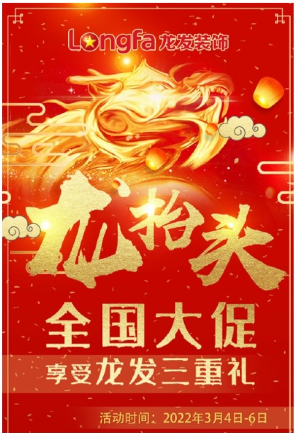 3月4日,“二月二,龍抬頭”,又到了龍發裝飾全國大促開啟的時候。近年來,龍發裝飾連續多年在“二月二,龍抬頭”這一傳統節日到來之時,在全國范圍內舉行盛大促銷活動,回饋新老客戶。