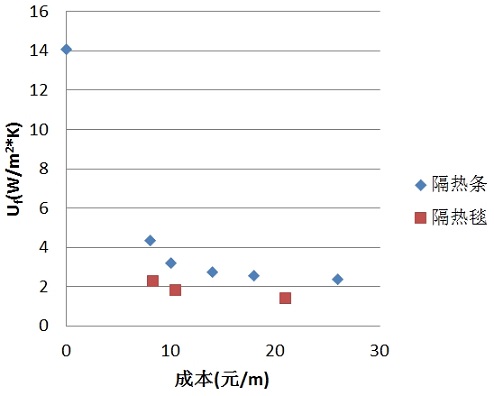 3)比較有機隔熱系統和暖框系統的性價比,當成本相同時,后者框的U值比前者平均降低45%;當框的U值相同時,后者的成本僅為前者的1/3。
