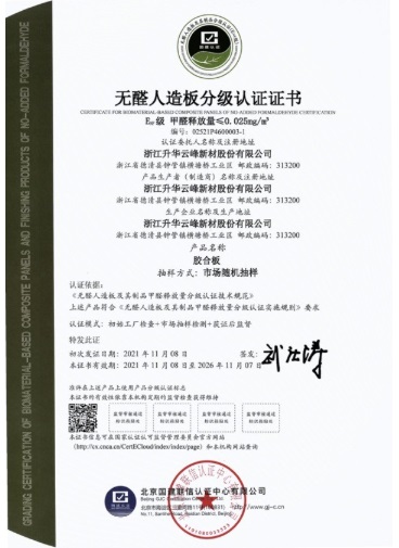 2019年,莫干山豆茵板基材通過了美國CARB-NAF無醛豁免認證。2020年,莫干山板材獲得中國環境標志產品認證和“兒童安全級產品”認證。2021年11月,莫干山板材膠合板、細木工板、飾面人造板等產品以市場隨機抽樣方式獲得了由國建聯信認證中心(GJC)認定產品符合GB/T 39600—2021《人造板及其制品甲醛釋放量分級》標準的無醛人造板分級認證證書,產品甲醛釋放量≤0.025mg/m³,評為ENF級,莫干山板材也成為行業首個獲得該證書的企業。2022年4月,莫干山浸漬膠膜紙飾面膠合板和細木工板符合《國家孕嬰網孕嬰產品綠色通道生產規范》和國家孕嬰網《托育與孕嬰居所環境安全防控規范》(Q/GJYY111.1-2020)的標準要求,被正式納入國家孕嬰產品綠色通道推薦目錄,同時入駐國家孕嬰網國孕商城,獲得“國家孕嬰網入網推薦證書”。