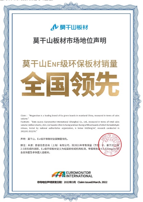 莫干山ENF級板材:獲歐睿國際權威認證,全國銷量領先,再掀行業綠色風暴