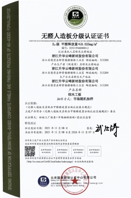 2020年,莫干山板材獲得中國環境標志產品認證和“兒童安全級產品”認證。2021年11月,莫干山板材膠合板、細木工板、飾面人造板等產品以市場隨機抽樣方式獲得了由國建聯信認證中心(GJC)依據GB/T 39600—2021《人造板及其制品甲醛釋放量分級》標準頒發的無醛人造板分級認證證書,莫干山板材被鑒定為ENF級,莫干山板材也成為行業首個獲得該證書的企業。今年4月,莫干山浸漬膠膜紙飾面膠合板和細木工板符合《國家孕嬰網孕嬰產品綠色通道生產規范》和國家孕嬰網《托育與孕嬰居所環境安全防控規范》(Q/GJYY111.1-2020)的標準要求,被正式納入國家孕嬰產品綠色通道推薦目錄,同時獲得了“國家孕嬰網入網推薦證書”。