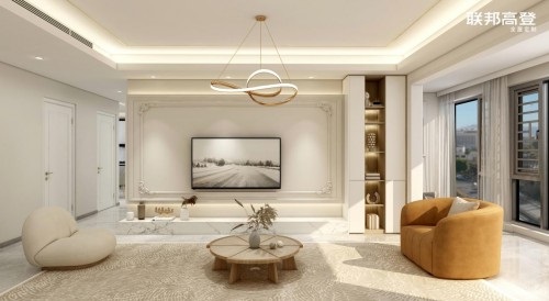 奶油風空間少不了的溫柔色系絲滑搭配,電視背景墻以輕盈相搭帶來賞心悅目,慵懶時光下,讓感官與功能相諧。